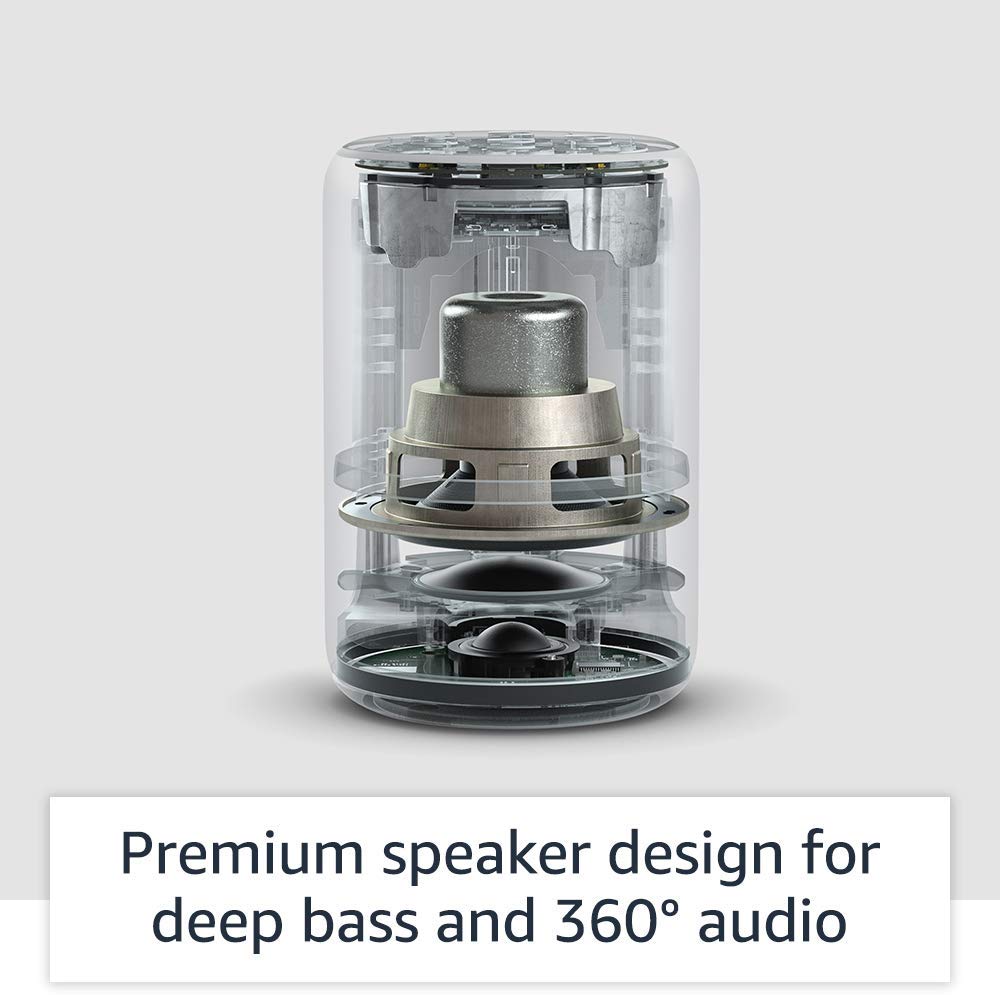 امازون ايكو "اليكسا" الجيل الثالث عبارةً عن سماعة صوت منزلية بحجم 4 * 6 سم و سب هوڤر داخلي قوي 3 انش, مزودةٍ بمجموعةٍ من الميكروفونات بعيدة المجال و بصوت دولبي 360 درجة تعمل بالذكاء الأصطناعي و تقوم بالعديد من المهام عن طريق الأوامر الصوتية